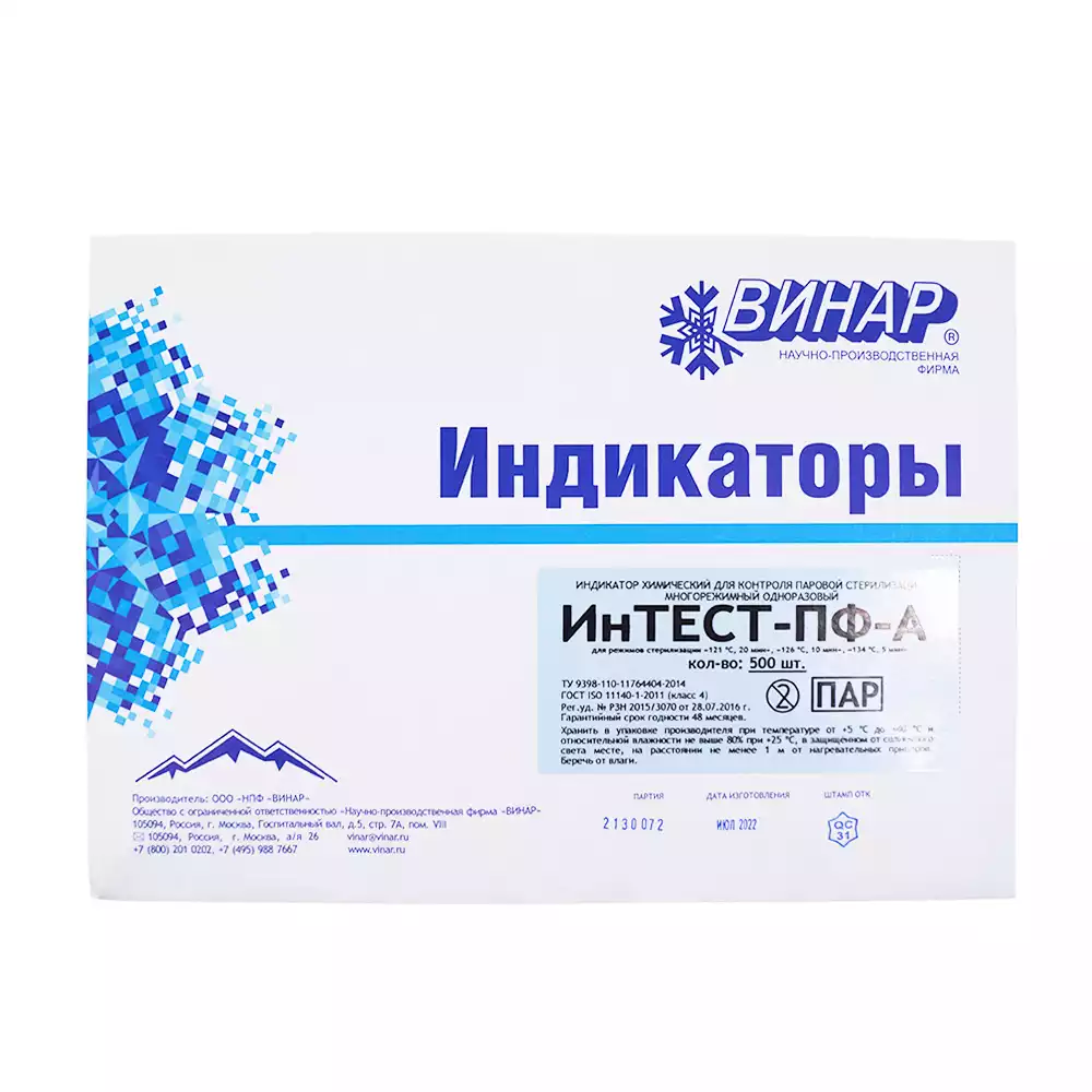 Индикатор стерилизации ИНТЕСТ-ПФ-А, универсальный для 3-х режимов, самоклеющийся, упаковка 500 тестов, без журнала, для контроля внутри и снаружи, Винар НПФ (РОССИЯ)