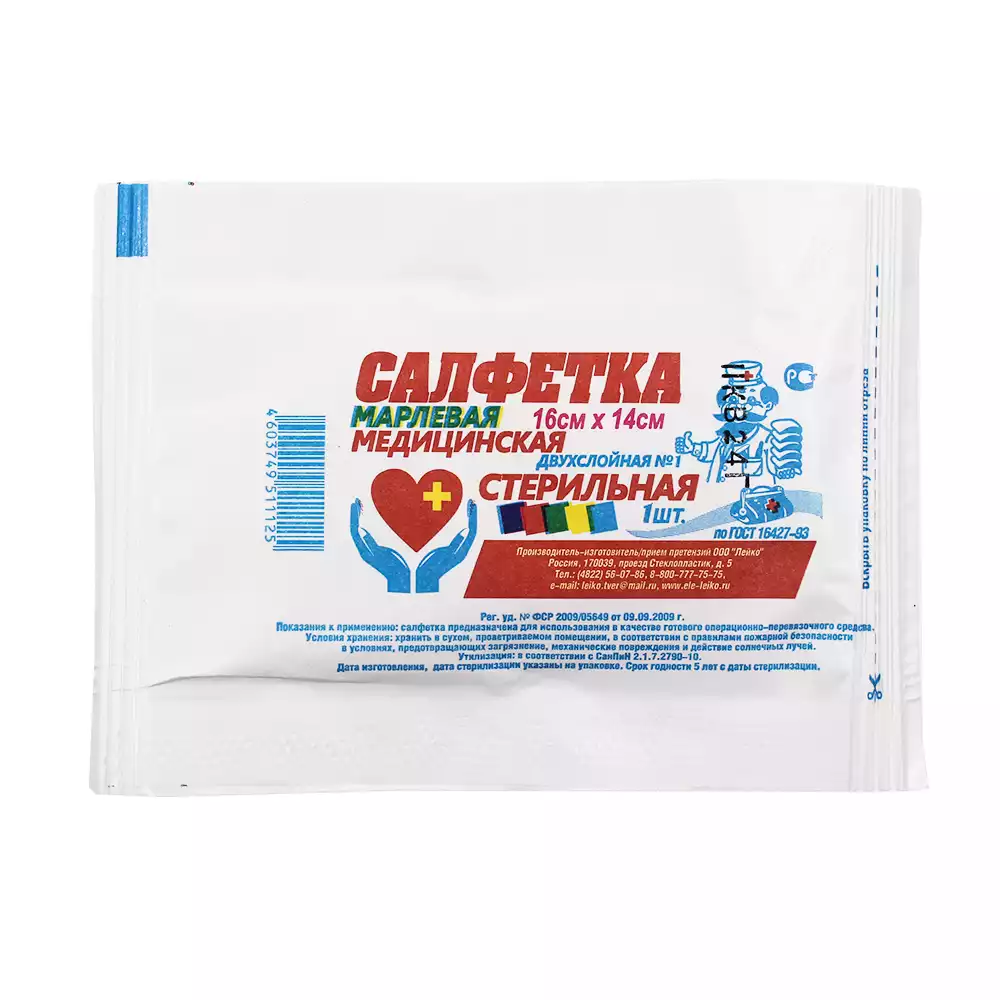 Салфетка марлевая №1, 2-х слойная, размер 16*14см Лейко, плотность 36г/м2, стерильная, Лейко (РОССИЯ)
