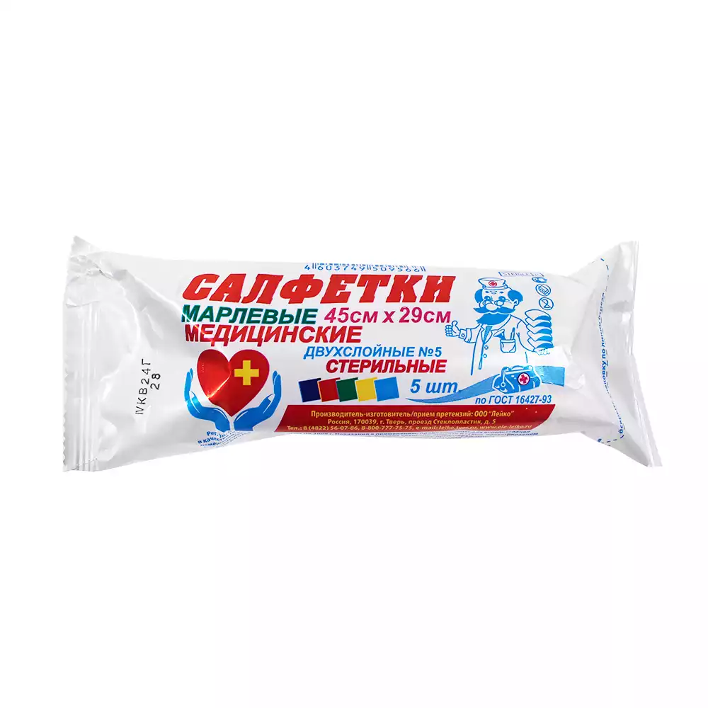 Салфетка марлевая №5, 2-х слойная размер 45*29см Лейко плотность 28г/м2, стерильная, Лейко (РОССИЯ)