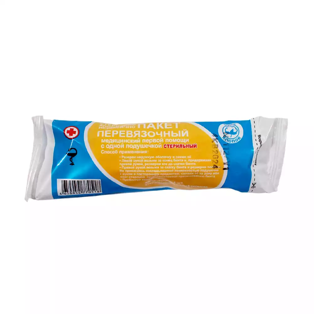 Пакет перевязочный медицинский 1-ой помощи с одной подушечкой, инивидуальный, с бинтом, стерильный, Верамед (РОССИЯ)