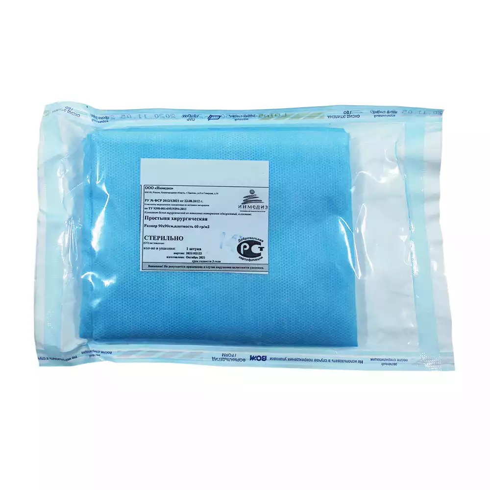 Простыня 70*80см, материал СМС 42м2, стерильная, голубая, с РУ, Инмедиз (РОССИЯ)