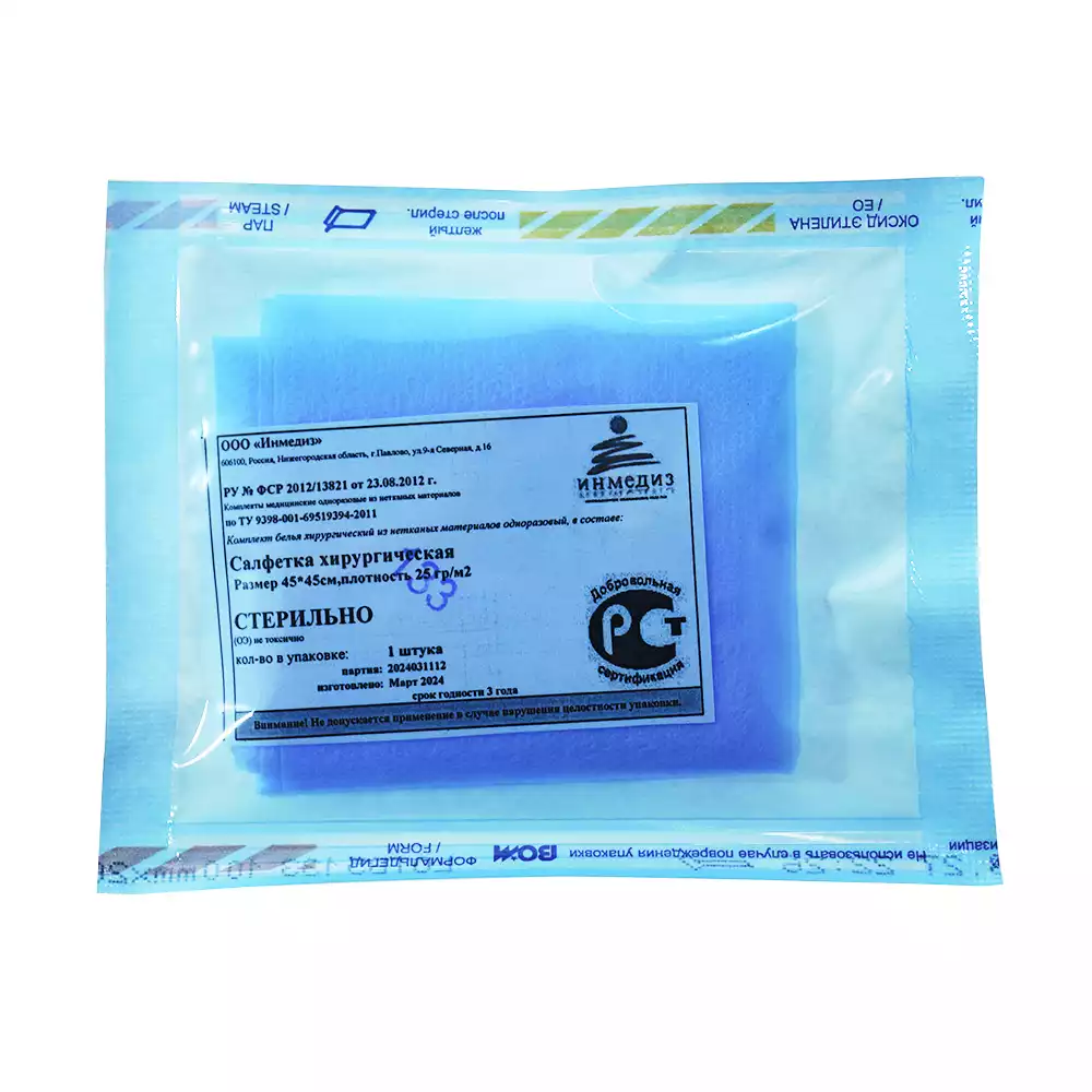 Салфетка 45*45см, материал СМС 25г/м2, стерильная, цвет голубой, Инмедиз (РОССИЯ)