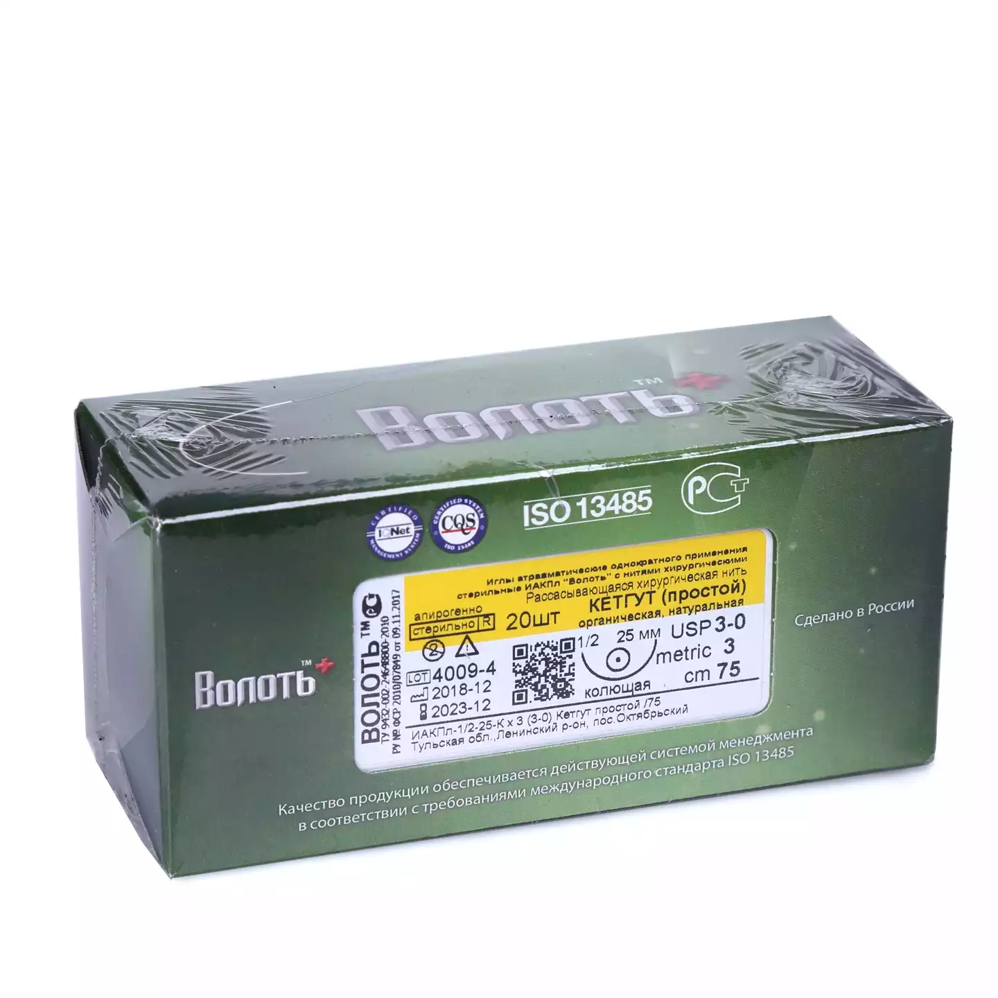 Кетгут простой USP №3/0, длина нити 75см, игла колющая, изгиб 1/2 окружности, длина 25мм, одноигольная,стерильный, Волоть (РОССИЯ), 20 шт